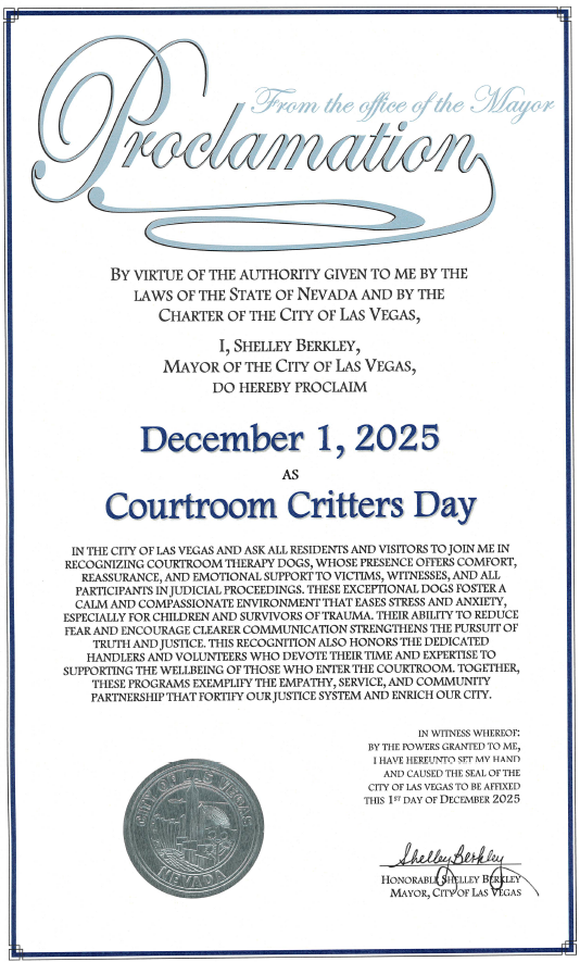 Mayor Shelley Berkley officially proclaimed December 1 as Courtroom Critters Day in the City of Las Vegas.